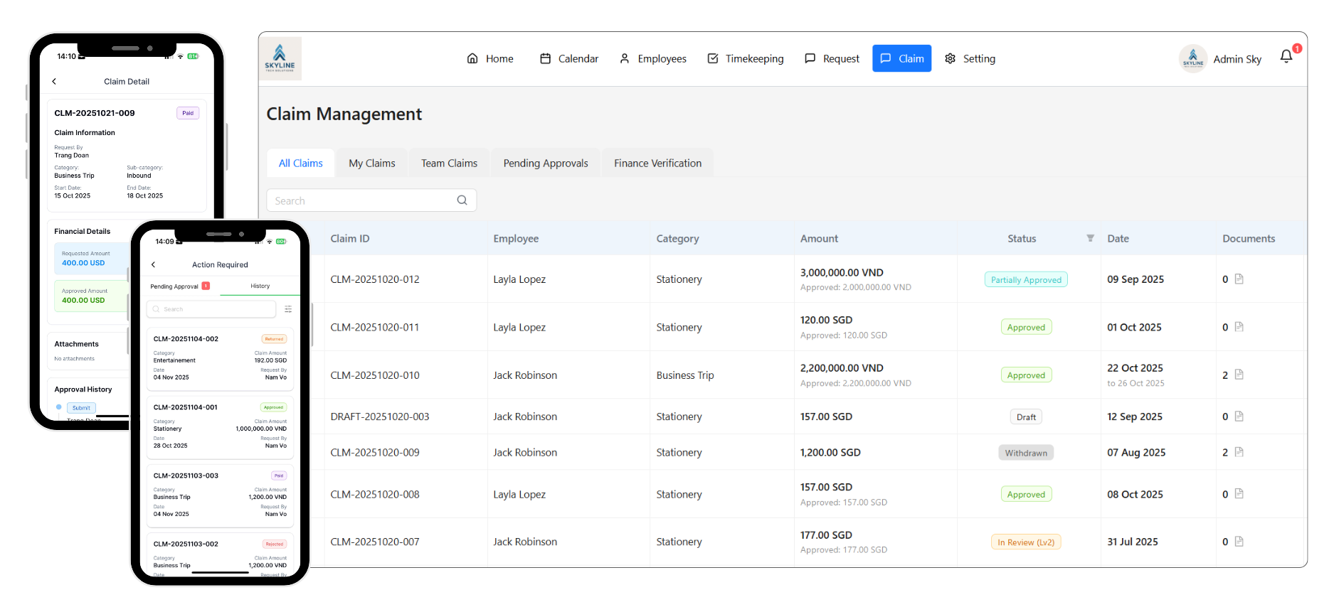 Employees can submit expense claims easily, while managers review and approve digitally — transparent and traceable.
