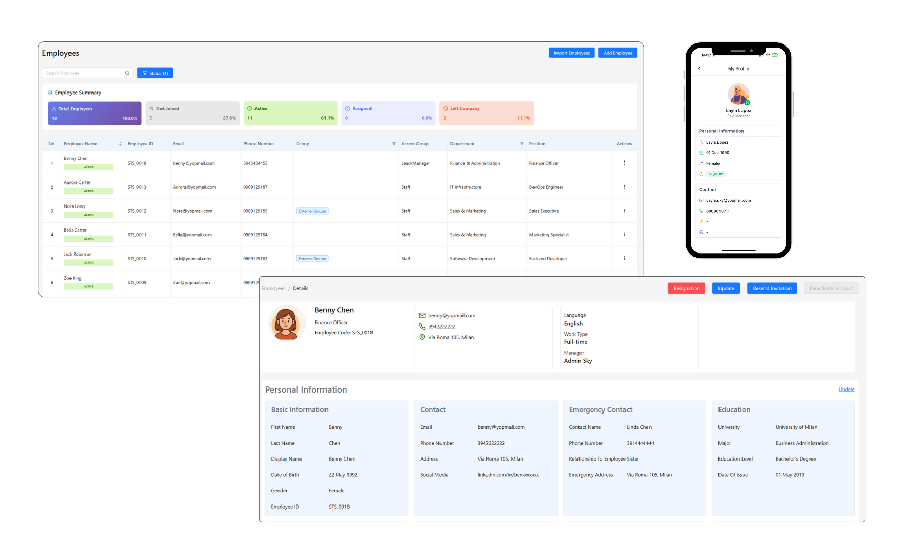 A centralized profile for every employee — roles, documents, and activity all in one secure place.
