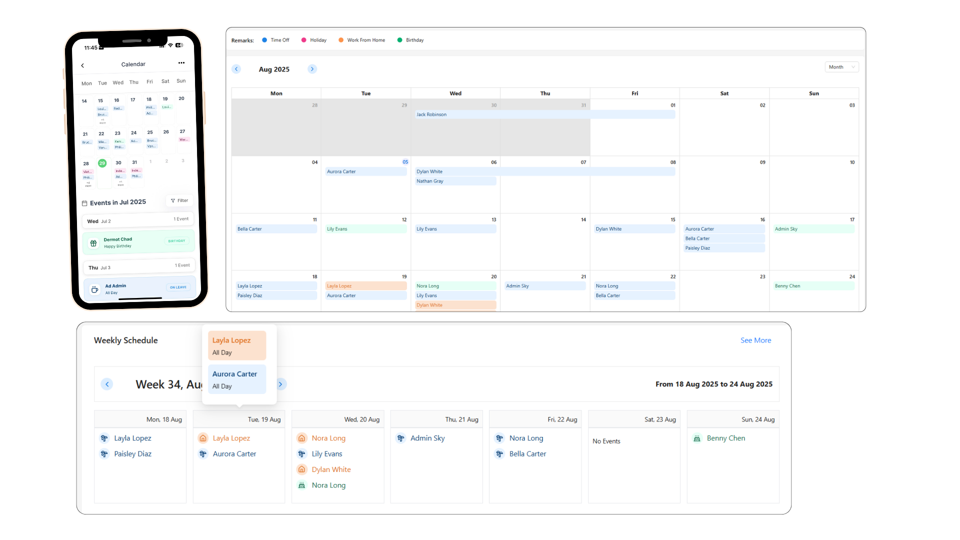 View company holidays, birthdays, and team absences — all integrated into one shared calendar.
