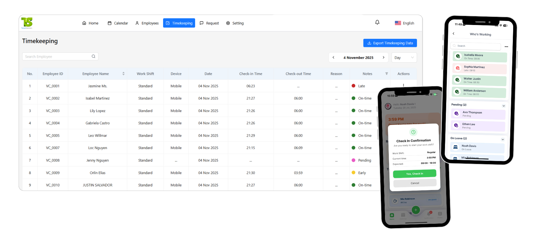 Talent Solution offers a web portal for Admins and a mobile app for Employees, ensuring smooth HR operations from setup to daily use — anytime, anywhere.