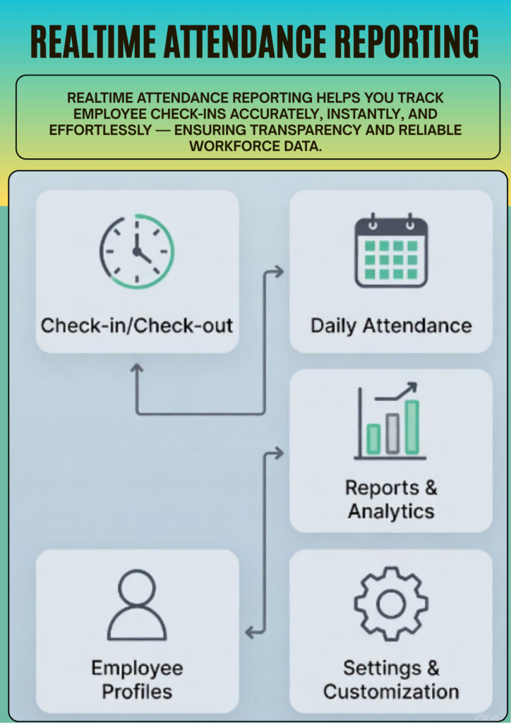 Realtime attendance reporting gives businesses instant visibility into employee check-ins, working hours, productivity patterns, and compliance. Whether your team works on-site, remotely, or across multiple locations, real-time tracking ensures every time entry is accurate, automated, and transparent.