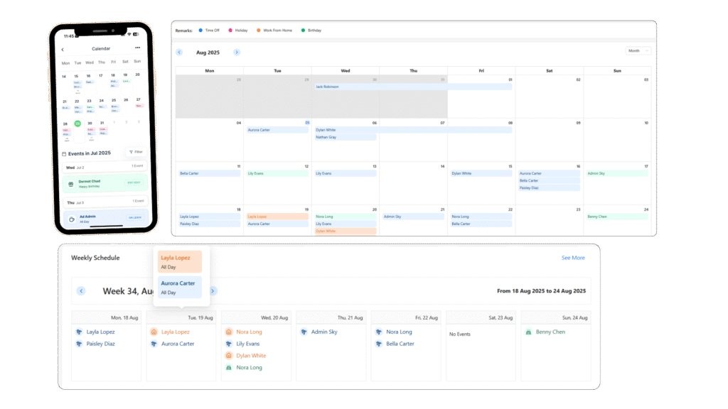 Our system visualizes time off, remote work, holidays, birthdays, team schedules, and weekly planning — all displayed clearly just like in the image above. Whether you’re using desktop or mobile, the smart calendar helps you: