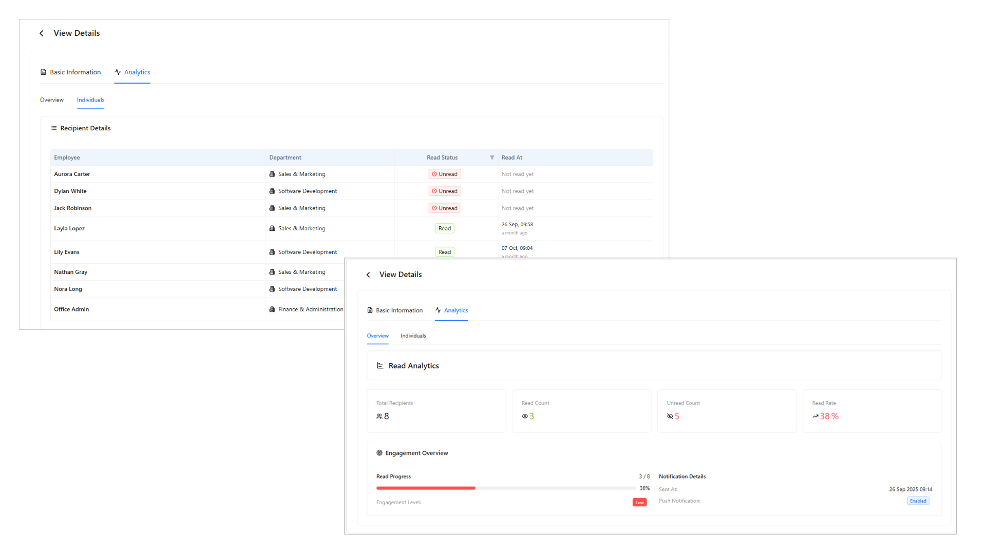 Track read/unread status per employee View total read rate & engagement score Filter by department or announcement